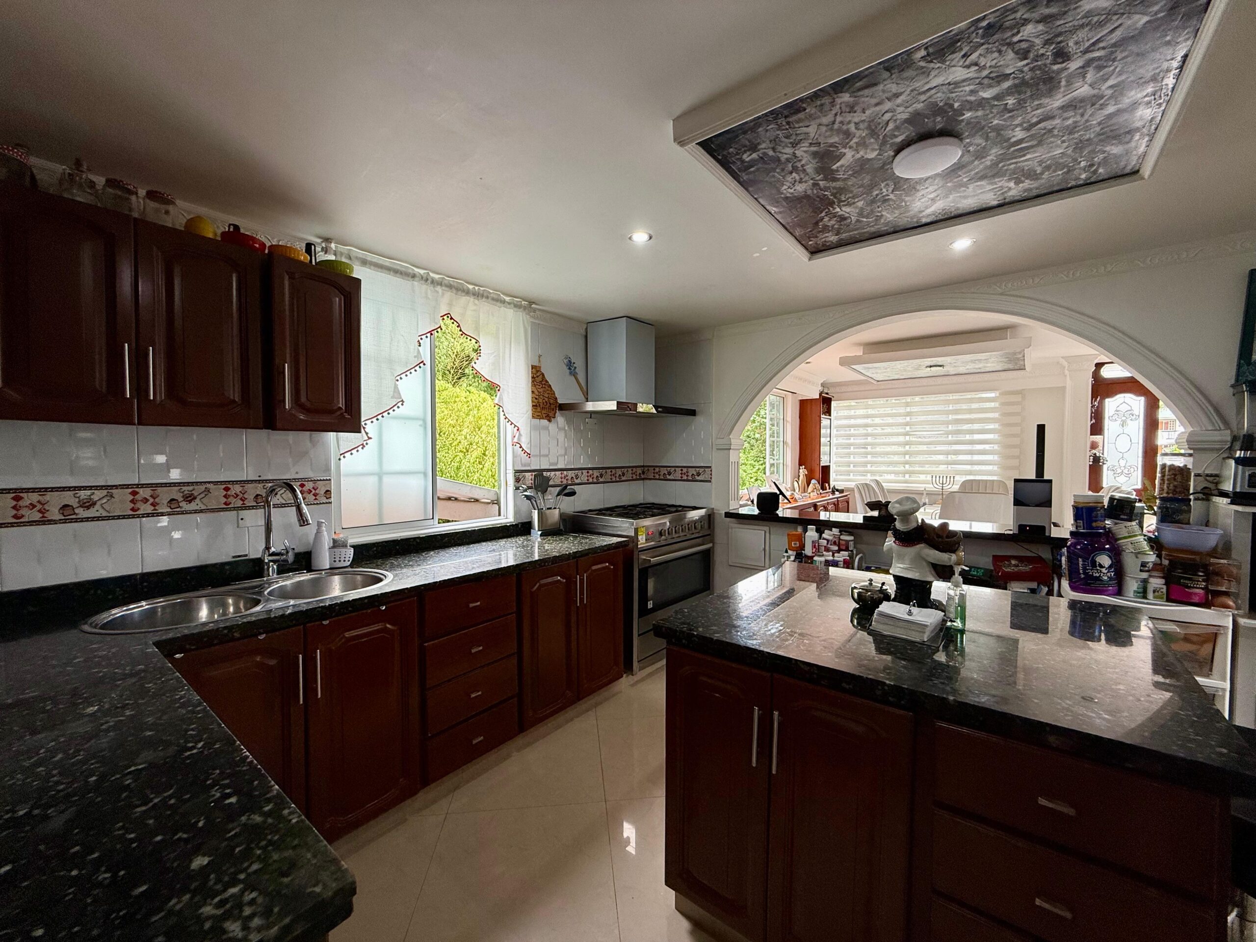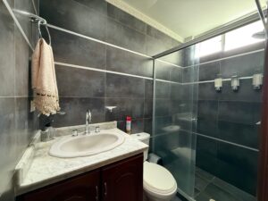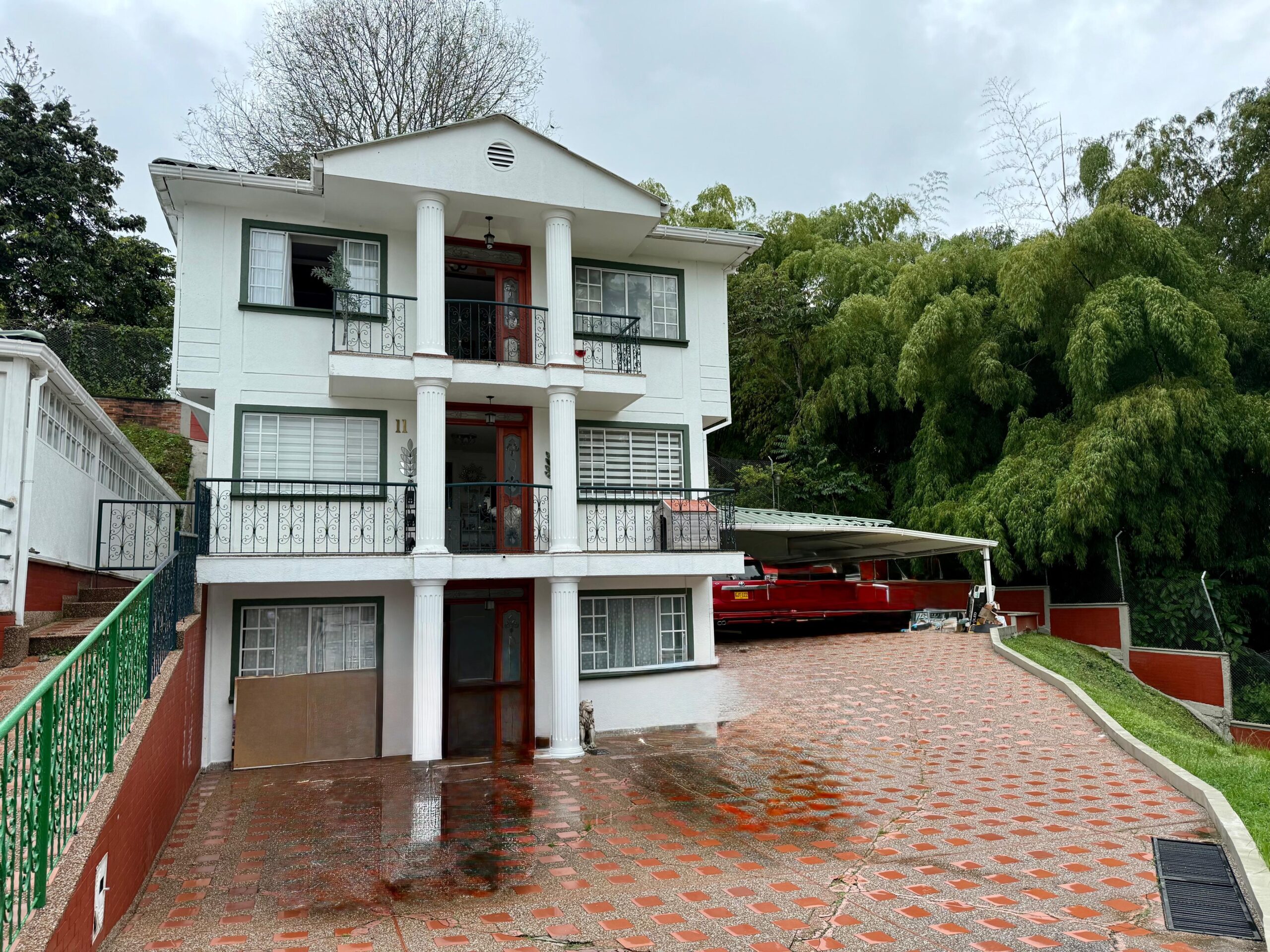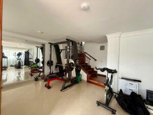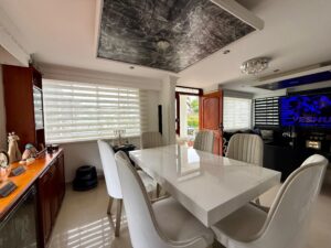 Tiene 3 pisos, 4 habitaciones, 5 baños, 5 parqueaderos, gimnasio, sala y cocina.